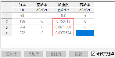 ①“窄带随机”中,选择“量级-谱图设置方式”,将4个中心频率点的频率和斜率设置出来,通过计算交越点得到每个中心频率的加速度谱密度。