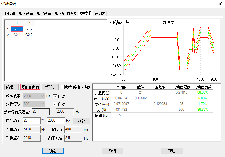 6.“参考谱”中,双击“G1,1”。在“G1,1”界面参照40dB谱图形状设置参考谱,并点击“调整”按钮,调至8g有效值。